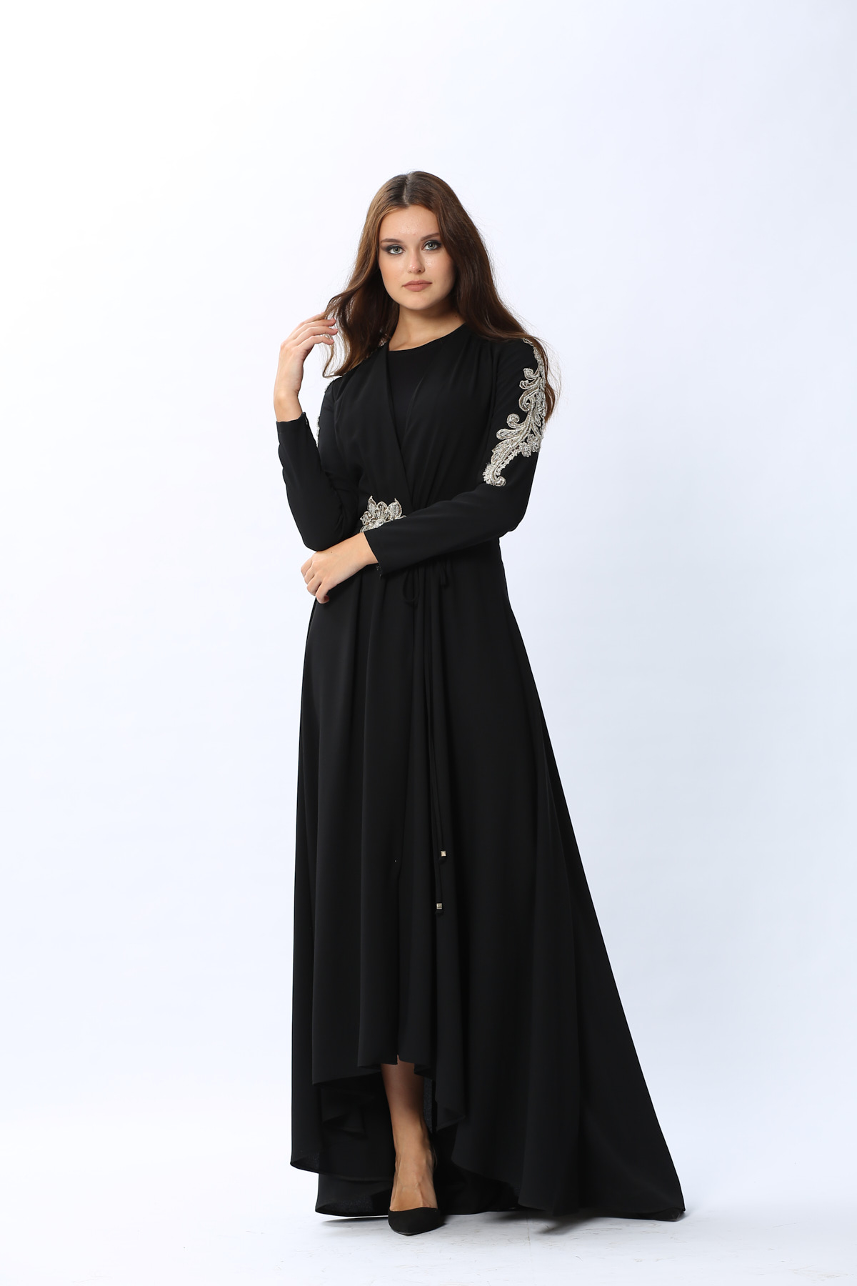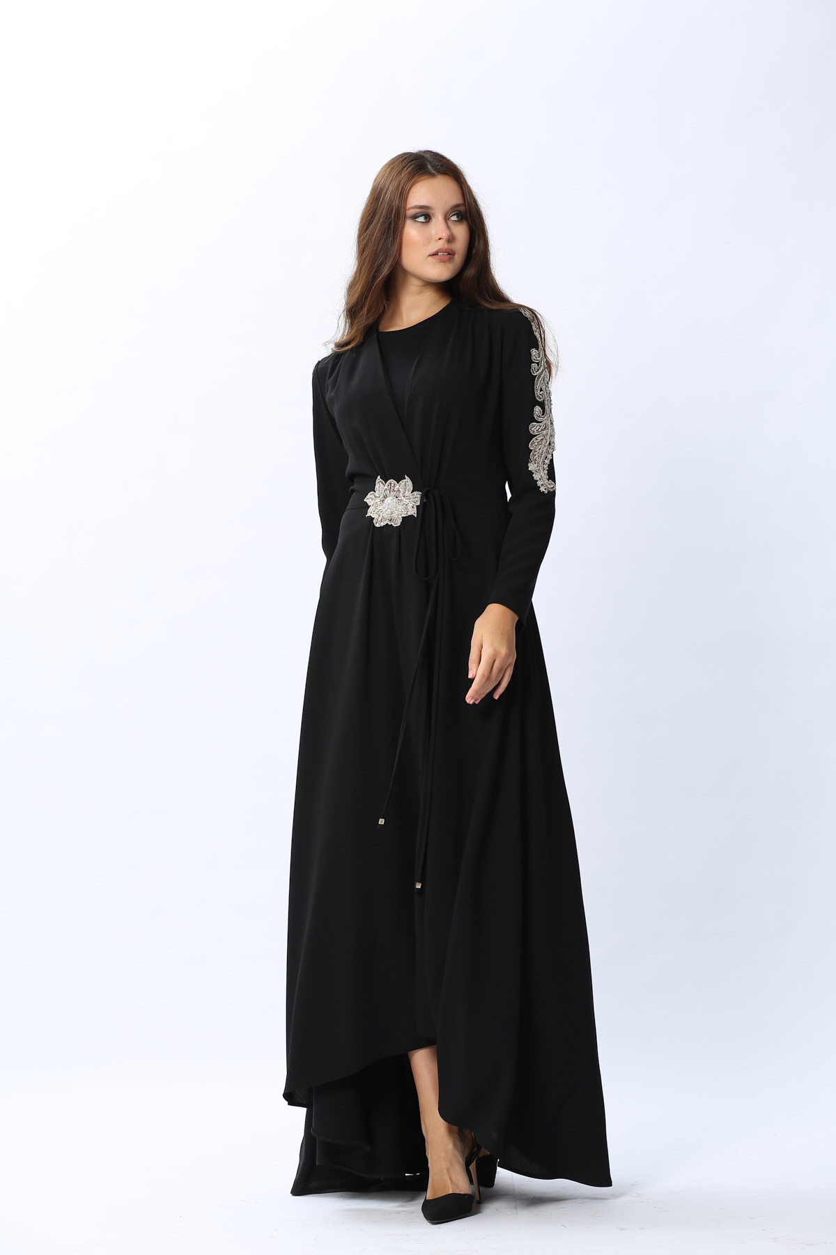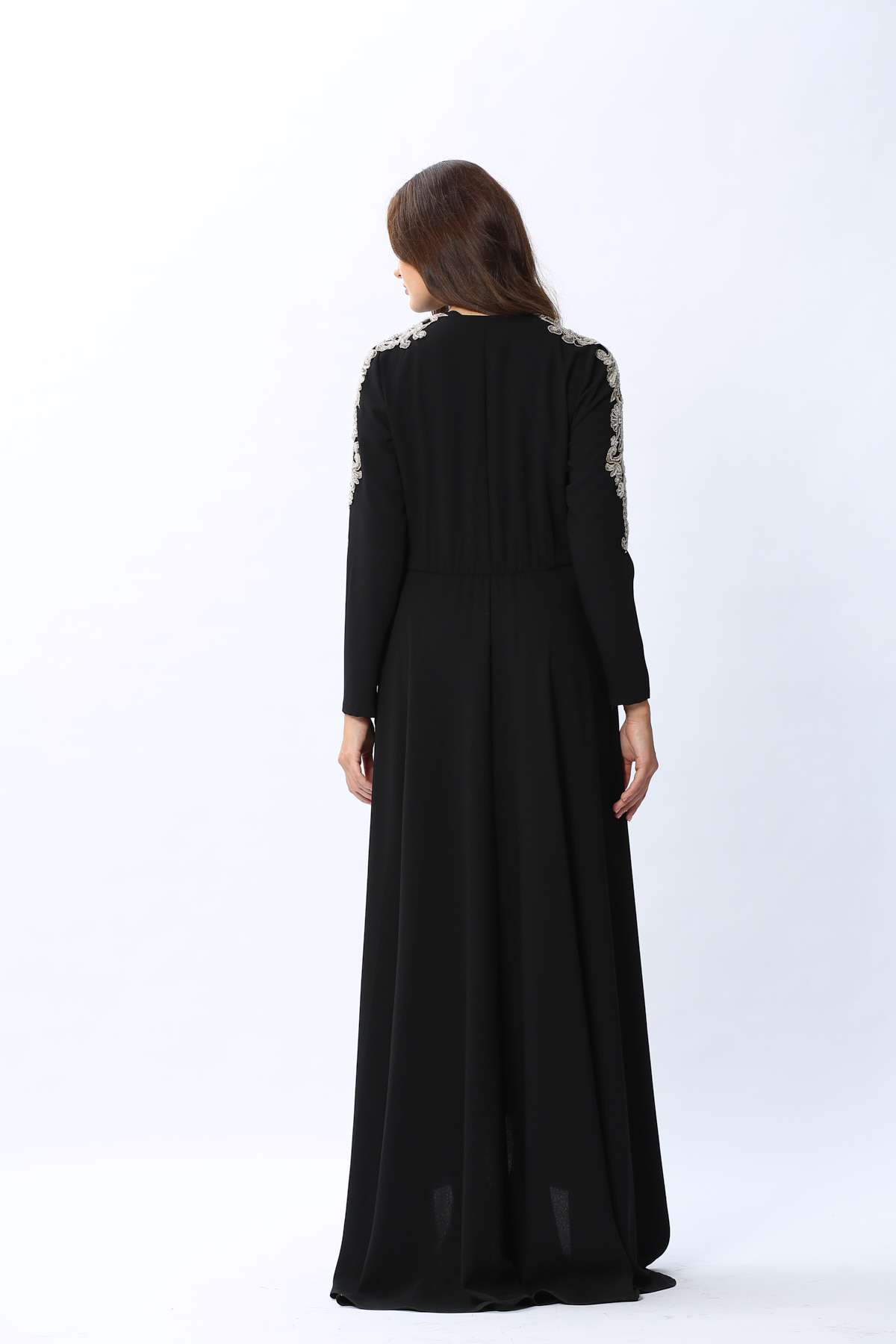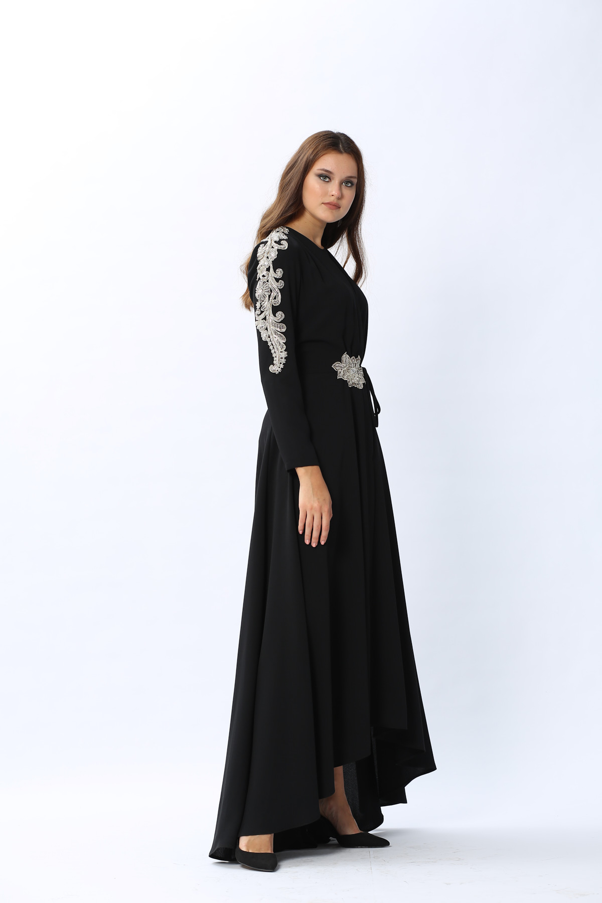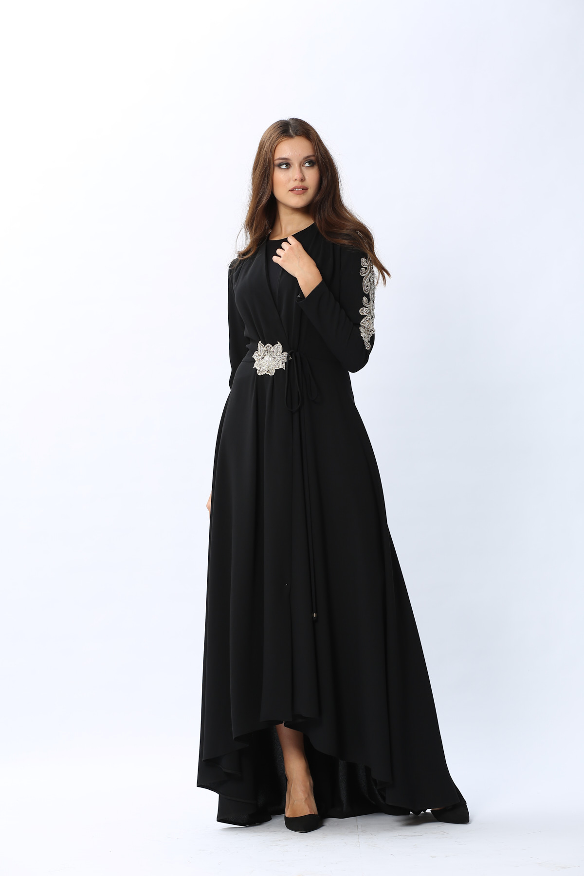 Kol ve bel kısmındaki harika el işleme detaylarıyla MargueriteElbisenin büyüsüne kapılacaksınız!Özel günlerinizde rahatlıkla tercih edebilirsiniz.Elbisemiz ikiParçadan oluşmaktadır,içinde kolsuz bir elbise dışında kruvazeKapamalı diğer elbise mevcuttur.*Uzun boy*El işlemeManken ölçüleri:giydiği beden 36Manken boyu:175cmÖlçüler:göğüs84cm,bel 62cm, basen 90cm36 beden ürün ölçüleri:Pazu:17cmKol boyu:60cmÖn boy uzunluğu:133cmAğırlık(Kg):800Ürün ÖzellikleriRenk:Siyah